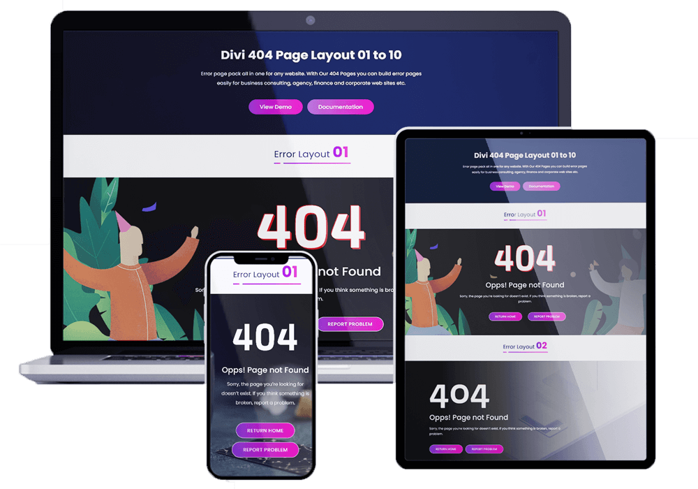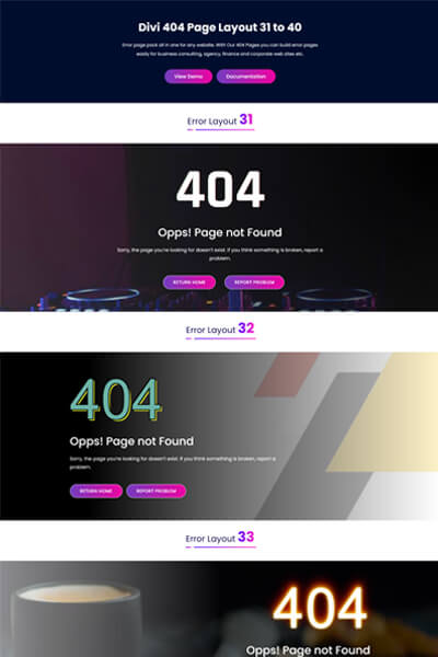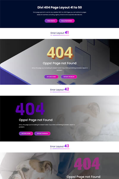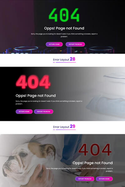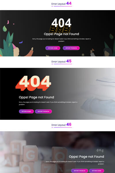 Error page pack all in one for any website. With Our 404 Pages you can build error pages easily for business consulting, agency, finance and corporate web sites etc.