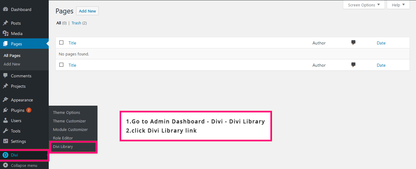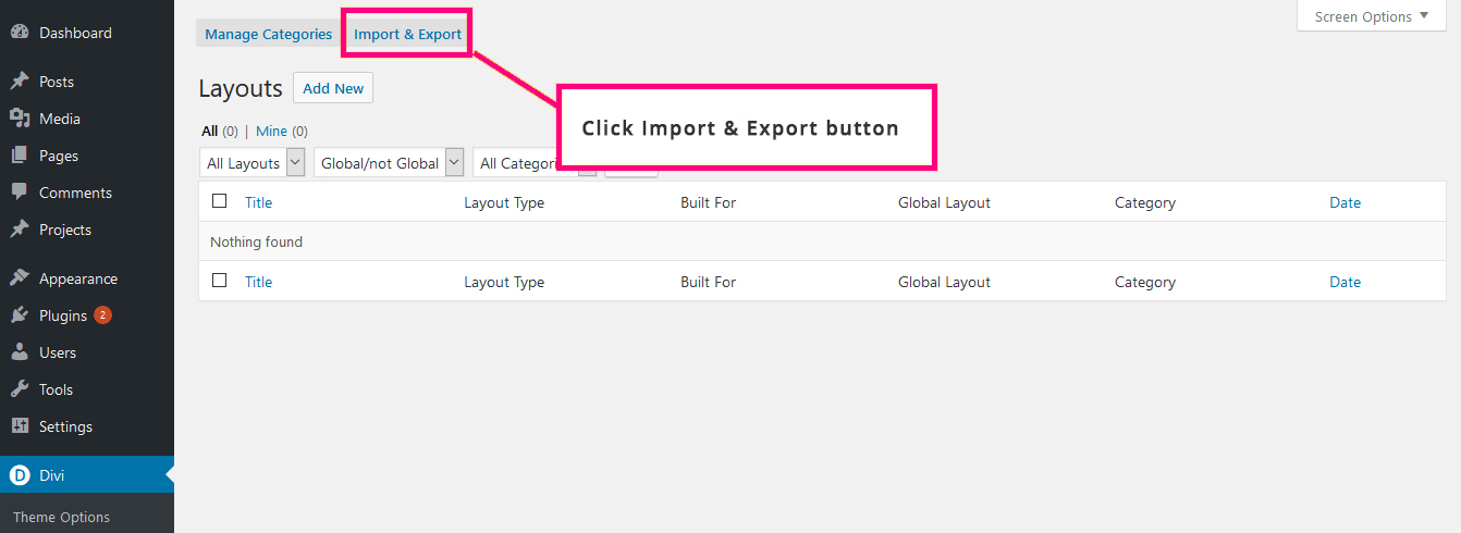 Go to your site and locate ‘Divi’> ‘Divi Library’> ‘Import and Export’