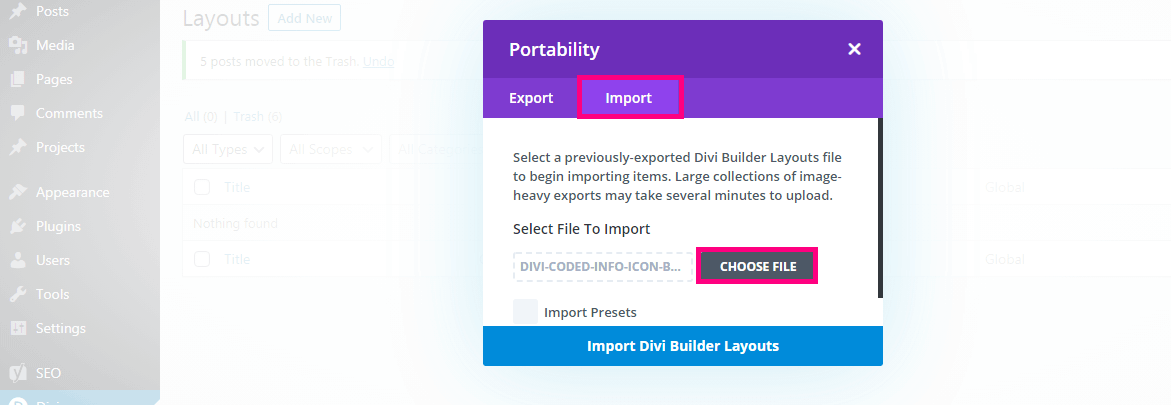Click On Import Option > Choose File > Choose Given Divi Library .json File